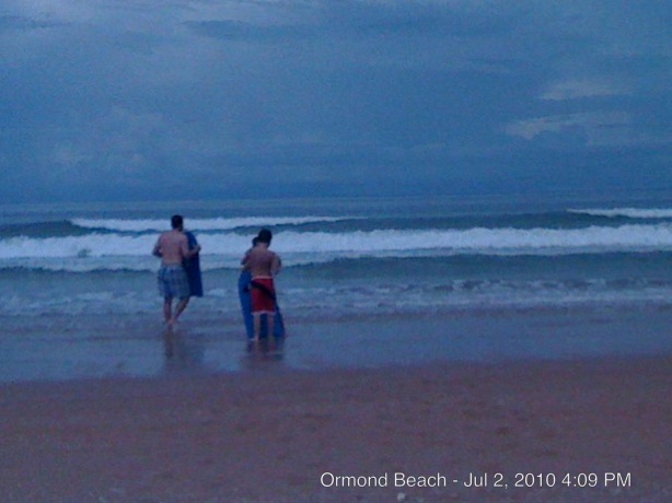 Okay, so he came back to the shore and sat down next to me. I could see he was disappointed he couldn’t be out in the water. This is the first summer he hasn’t gone in the water…which tells me that it must feel worse than it did last year, because I don’t recall him making it an issue last summer, or maybe it’s because the water here is that much colder than in Galveston! So he’s watching them try and try again to ‘catch the wave’ in and they are missing their moment. He gets up and tries to yell over to them when to go but they can’t hear what he’s saying. He comes and sits next to me again and after a few moments he says we need music so he walks back to the house to get a radio. That’s when I decided to get in the water and help the boys out.