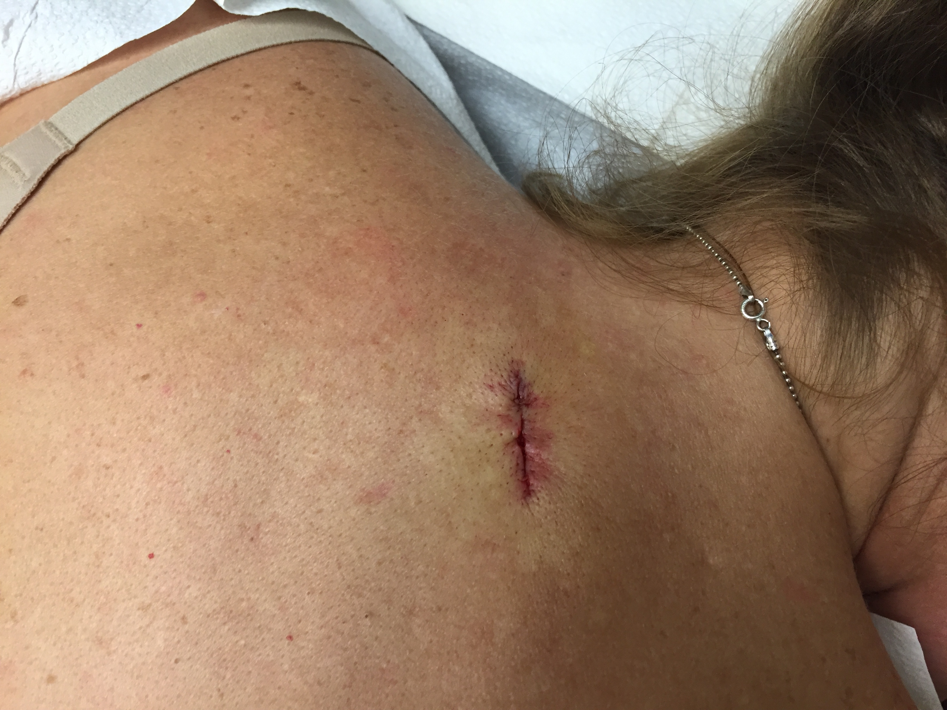 BTW, I had the cancer removed this morning…it looks like I’ve been stabbed in the back. What story can I make up about this??? Hm…. 😉 I know it’s gross but I’ll share the picture any way…maybe it’ll convince you to put on your sunscreen.